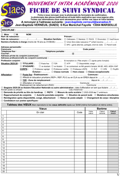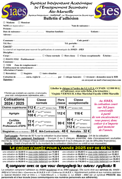 Bulletin d'adhésion. Au SIAES, la cotisation court sur 365 jours. En adhérant en mars 2026, vous serez adhérent(e) jusqu'en mars 2027. haut page AMIENS Site du Rectorat : http://www.ac-amiens.fr Adhérents, si vous ne l'avez pas déjà fait, prenez contact avec nous et communiquez-nous la liste de vos voeux provisoires avant la fermeture du serveur SIAM. Nous vous proposerons des améliorations stratégiques. 04 91 34 89 28 - 06 80 13 44 28 - jean-baptiste.verneuil@wanadoo.fr Il s'agit de nos numéros personnels (pas de standardiste ou de secrétaire) réservés aux adhérents. Déposez un message sur le répondeur téléphonique afin d'être rappelé. Calendrier des visioconférences "mutations intra" du SIAES - SIES haut page BESANÇON Site du Rectorat : http://www.ac-besancon.fr Adhérents, si vous ne l'avez pas déjà fait, prenez contact avec nous et communiquez-nous la liste de vos voeux provisoires avant la fermeture du serveur SIAM. Nous vous proposerons des améliorations stratégiques. 04 91 34 89 28 - 06 80 13 44 28 - jean-baptiste.verneuil@wanadoo.frIl s'agit de nos numéros personnels (pas de standardiste ou de secrétaire) réservés aux adhérents. Déposez un message sur le répondeur téléphonique afin d'être rappelé. Calendrier des visioconférences "mutations intra" du SIAES - SIES haut pageSite du Rectorat : http://www.ac-bordeaux.fr Adhérents, si vous ne l'avez pas déjà fait, prenez contact avec nous et communiquez-nous la liste de vos voeux provisoires avant la fermeture du serveur SIAM. Nous vous proposerons des améliorations stratégiques. 04 91 34 89 28 - 06 80 13 44 28 - jean-baptiste.verneuil@wanadoo.fr Il s'agit de nos numéros personnels (pas de standardiste ou de secrétaire) réservés aux adhérents. Déposez un message sur le répondeur téléphonique afin d'être rappelé. Calendrier des visioconférences "mutations intra" du SIAES - SIES haut page CLERMONT Site du Rectorat : http://www.ac-clermont.fr Adhérents, si vous ne l'avez pas déjà fait, prenez contact avec nous et communiquez-nous la liste de vos voeux provisoires avant la fermeture du serveur SIAM. Nous vous proposerons des améliorations stratégiques. 04 91 34 89 28 - 06 80 13 44 28 - jean-baptiste.verneuil@wanadoo.frIl s'agit de nos numéros personnels (pas de standardiste ou de secrétaire) réservés aux adhérents. Déposez un message sur le répondeur téléphonique afin d'être rappelé. Calendrier des visioconférences "mutations intra" du SIAES - SIES haut page CORSE Site du Rectorat : http://www.ac-corse.fr Adhérents, si vous ne l'avez pas déjà fait, prenez contact avec nous et communiquez-nous la liste de vos voeux provisoires avant la fermeture du serveur SIAM. Nous vous proposerons des améliorations stratégiques. 04 91 34 89 28 - 06 80 13 44 28 - jean-baptiste.verneuil@wanadoo.frIl s'agit de nos numéros personnels (pas de standardiste ou de secrétaire) réservés aux adhérents. Déposez un message sur le répondeur téléphonique afin d'être rappelé. Calendrier des visioconférences "mutations intra" du SIAES - SIES haut page CRÉTEIL Site du Rectorat : http://www.ac-creteil.fr Adhérents, si vous ne l'avez pas déjà fait, prenez contact avec nous et communiquez-nous la liste de vos voeux provisoires avant la fermeture du serveur SIAM. Nous vous proposerons des améliorations stratégiques. 04 91 34 89 28 - 06 80 13 44 28 - jean-baptiste.verneuil@wanadoo.frIl s'agit de nos numéros personnels (pas de standardiste ou de secrétaire) réservés aux adhérents. Déposez un message sur le répondeur téléphonique afin d'être rappelé. Calendrier des visioconférences "mutations intra" du SIAES - SIES haut pageSite du Rectorat : http://www.ac-dijon.fr Adhérents, si vous ne l'avez pas déjà fait, prenez contact avec nous et communiquez-nous la liste de vos voeux provisoires avant la fermeture du serveur SIAM. Nous vous proposerons des améliorations stratégiques. 04 91 34 89 28 - 06 80 13 44 28 - jean-baptiste.verneuil@wanadoo.fr Il s'agit de nos numéros personnels (pas de standardiste ou de secrétaire) réservés aux adhérents. Déposez un message sur le répondeur téléphonique afin d'être rappelé. Calendrier des visioconférences "mutations intra" du SIAES - SIES haut page GRENOBLE Site du Rectorat : http://www.ac-grenoble.fr Adhérents, si vous ne l'avez pas déjà fait, prenez contact avec nous et communiquez-nous la liste de vos voeux provisoires avant la fermeture du serveur SIAM. Nous vous proposerons des améliorations stratégiques. 04 91 34 89 28 - 06 80 13 44 28 - jean-baptiste.verneuil@wanadoo.frIl s'agit de nos numéros personnels (pas de standardiste ou de secrétaire) réservés aux adhérents. Déposez un message sur le répondeur téléphonique afin d'être rappelé. Calendrier des visioconférences "mutations intra" du SIAES - SIES haut page GUADELOUPE Site du Rectorat : http://www.ac-guadeloupe.fr Adhérents, si vous ne l'avez pas déjà fait, prenez contact avec nous et communiquez-nous la liste de vos voeux provisoires avant la fermeture du serveur SIAM. Nous vous proposerons des améliorations stratégiques. 04 91 34 89 28 - 06 80 13 44 28 - jean-baptiste.verneuil@wanadoo.frIl s'agit de nos numéros personnels (pas de standardiste ou de secrétaire) réservés aux adhérents. Déposez un message sur le répondeur téléphonique afin d'être rappelé. Calendrier des visioconférences "mutations intra" du SIAES - SIES haut page GUYANE Site du Rectorat : http://www.ac-guyane.fr Adhérents, si vous ne l'avez pas déjà fait, prenez contact avec nous et communiquez-nous la liste de vos voeux provisoires avant la fermeture du serveur SIAM. Nous vous proposerons des améliorations stratégiques. 04 91 34 89 28 - 06 80 13 44 28 - jean-baptiste.verneuil@wanadoo.frIl s'agit de nos numéros personnels (pas de standardiste ou de secrétaire) réservés aux adhérents. Déposez un message sur le répondeur téléphonique afin d'être rappelé.