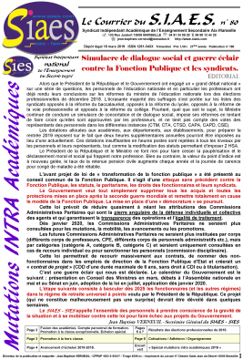 Le SIAES - SIES appelle à la grève à partir du 5 décembre. Le SIAES - SIES appelle aux manifestations et à la journée de grève interprofessionnelle du 5 décembre. Le SIAES a également déposé un préavis de grève pour la période du 5 au 21 décembre 2019 afin de permettre une grève reconductible et couvrir toutes les initiatives et actions locales. La "clause du grand père" que le Président de la République envisage désormais d'appliquer afin de nous diviser et ainsi limiter l'ampleur de la contestation est également totalement inacceptable. Pouvons-nous nous résigner à ce que nos enfants et petits enfants subissent un système dont nous refusons qu'il s'applique à nous-mêmes ? Enfin, si la retraite universelle par points devait s'appliquer en étant assortie de la "clause du grand père", qui peut raisonnablement croire que ce gouvernement (ou un autre) ne reviendra pas à la charge dans quelques années, pour changer une nouvelle fois les règles et imposer la retraite universelle par points à ceux qui avaient initialement été épargnés ? Ces derniers seront alors beaucoup moins nombreux pour pouvoir se défendre efficacement. Le SIAES - SIES appelle ses adhérents et sympathisants à organiser et/ou à participer aux heures d'informations syndicales ou assemblées générales consacrées à la défense du Code des Pensions Civiles et Militaires de retraite, à se mobiliser et à mobiliser leurs collègues pour la grève et les manifestations du 5 décembre et à discuter des suites à donner à la grève du 5 décembre (grève reconductible). Si chacun se mobilise et mobilise ses collègues, les conditions sont réunies pour construire un rapport de force permettant d'obtenir le retrait du projet de retraite universelle par points. Vous trouverez ci-dessous les liens pour télécharger, imprimer, afficher sur le panneau syndical et distribuer dans les casiers différents documents : - Tract intersyndical national page 1 : http://www.siaes.com/publications/communiques/tract_inter2d_05-12-2019_1.pdf - Tract intersyndical national page 2 : http://www.siaes.com/publications/communiques/tract_inter2d_05-12-2019_2.pdf - Editorial du Courrier du SIAES n° 82 du 17 octobre : http://www.siaes.com/publications/courriers/courrier_82.pdf - Communiqué intersyndical national du 24 octobre : http://www.sies.fr/courriers_publications/communiques/communique_presse_intersyndical_24102019.pdf Revalorisation des traitements ou paupérisation d'une profession ? Les faits sont têtus et démentent à la fois la propagande du Président de la République et du Ministre de l’Education Nationale prétendant que les professeurs bénéficieront d’une revalorisation de 300 euros durant l’année 2020 et la propagande des tenants du protocole PPCR affirmant avoir négocié et obtenu une « revalorisation historique » pour la profession. http://www.siaes.com/diff_aix/2019-2020/revalorisation_janvier_2020.htm Education prioritaire : Etat des différentes indemnités versées. Indemnité REP+, indemnité REP, NBI, indemnité ZEP ou ECLAIR et clause de sauvegarde transitoire.... http://www.siaes.com/diff_aix/2019-2020/education_prioritaire_indemnites.htm Formations durant les vacances. Professeurs : taillables et, désormais, corvéables à merci ! Le décret n° 2019-935 du 6 septembre 2019 permet d’imposer, par année scolaire, cinq journées de formation pendant les périodes de vacance des classes. http://www.siaes.com/diff_aix/2019-2020/formations_vacances.htm Suppression de l'accès par liste d'aptitude aux corps des professeurs certifiés et des professeurs d'EPS. Le décret n° 2019-1043 du 10 octobre 2019 publié au Journal Officiel de la République Française du 12 octobre 2019 supprime à compter du 1er janvier 2020 l’accès aux corps des professeurs certifiés et des professeurs d’éducation physique et sportive par liste d’aptitude. Lire le communiqué du SIAES - SIES : Mutations : Mouvement inter académique 2020. La saisie des voeux pour les mutations inter académiques se fait du 19 novembre au 9 décembre 2019 à 12h00. Comme chaque année, l'équipe du SIAES - SIES - syndicat académique et national - est mobilisée pour : - informer et expliquer aux adhérents les règles du mouvement ; - conseiller les adhérents quant à la façon de formuler leurs voeux (stratégie à mettre en oeuvre) en fonction de leur situation personnelle ; - accompagner les adhérents dans leurs démarches (justificatifs à fournir, vérification du barème...). Consultez la page de notre site internet consacrée au mouvement inter académique : http://www.siaes.com/mutations/mouvement_2020/inter_2020/informations_inter_2020.htm Rendez-vous de carrière 2018-2019 : premières statistiques et contestation / recours. Consultez les statistiques réalisées par les commissaires paritaires du SIAES : http://www.siaes.com/publications/carriere/rdv_carriere/courrier_82_page_7.pdf Consultez la page de notre site internet consacrée aux rendez-vous de carrière : http://www.siaes.com/publications/carriere/rdv_carriere/rendez_vous_carriere.htm Rendez-vous de carrière 2019-2020. Consultez la page de notre site internet consacrée aux rendez-vous de carrière : http://www.siaes.com/publications/carriere/rdv_carriere/rendez_vous_carriere.htm Dispositif d'accompagnement des personnels confrontés à des difficultés de santé (2020-2021). - Aménagement du poste de travail (allègement de service ; aménagement de l'emploi du temps hebdomadaire ; mise à disposition d'une salle de cours ou d'un équipement spécifique ; adaptation des horaires journaliers ; accompagnement par une assistance humaine) - Affectation sur poste adapté de courte ou de longue durée Demande à formuler avant le 4 décembre 2019. http://www.siaes.com/publications/carriere/sante/siaes_sante.htm Congé de formation professionnelle 2020-2021 Consultez la page de notre site internet consacrée au congé de formation profe