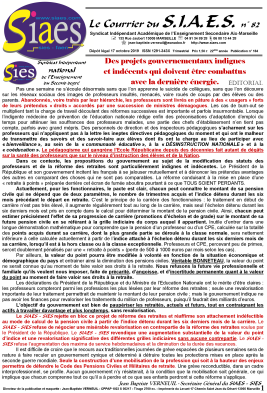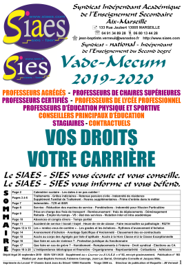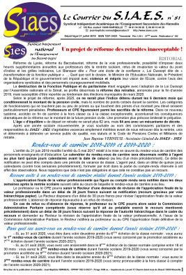 Le SIAES - SIES vous présente ses meilleurs voeux pour 2020 : santé, bonheur, prospérité, retrait de la réforme des retraites et abrogation de la Loi Dussopt ! Retrait de la réforme des retraites Le SIAES a déposé un préavis de grève pour la période du 6 au 18 janvier 2020 afin de permettre une grève reconductible et couvrir toutes les initiatives et actions locales. Ce préavis de grève sera reconduit de semaine en semaine, si le projet de réforme des retraites n'est pas retiré. Le SIAES - SIES appelle notamment à la grève et aux manifestations interprofessionnelles le Jeudi 9 janvier et le Samedi 11 janvier. La FAEN, fédération à laquelle est affilié le SIAES - SIES, est signataire du communiqué interfédéral national : Amplifions les mobilisations et la grève jusqu’au retrait ! http://www.siaes.com/publications/communiques/CP_interfederal_06012020.pdf - Jeudi 9 janvier : grève et manifestations Manifestation à Marseille : RDV SIAES à partir de 10h30 (pour un départ vers 11h00 / 11h30) à l'angle Canebière / boulevard Dugommier. - Samedi 11 janvier : manifestations Manifestation à Marseille : RDV SIAES à 14h00 au Vieux-Port. - Déterminés à défendre la Fonction Publique, nos retraites et celles de nos enfants ! http://www.siaes.com/publications/courriers/courrier_83.pdf - Des projets gouvernementaux indignes et indécents qui doivent être combattus avec la dernière énergie. http://www.siaes.com/publications/courriers/courrier_82.pdf Avancement d'échelon 2019-2020 des professeurs Certifiés. Page de notre site internet consacrée à l'avancement d'échelon des professeurs Certifiés : Depuis la rentrée 2017, l'avancement d'échelon est automatique, à l'ancienneté et n'est plus examiné en CAPA. Il y a cependant trois exceptions pour lesquelles la CAPA est convoquée : - l'avancement du 6ème au 7ème échelon de la classe normale qui peut être accéléré d'un an pour 30 % de l'effectif ; - l'avancement du 8ème au 9ème échelon de la classe normale qui peut être accéléré d'un an pour 30 % de l'effectif ; - l'accès à l'échelon spécial de la classe exceptionnelle qui ne peut se faire qu'au choix. http://www.siaes.com/publications/carriere/divers/SIAES_avancement_echelon.pdf Une seule CAPA consacrée à l'avancement d'échelon se réunit par année scolaire. Cette CAPA examinera les possibilités d'avancement accéléré comprises entre le 01/09/2019 et le 31/08/2020. A compter de l'année scolaire 2018-2019, la CAPA consacrée à l'avancement d'échelon prend en compte l'appréciation finale du Recteur suite au " RENDEZ-VOUS DE CARRIERE " réalisé durant l'année scolaire précédente. Certains collègues peuvent prétendre à des mois d'ASA (Avantage Spécifique d'Ancienneté). Consultez la page de notre site consacrée à l'avancement d'échelon pour prendre connaissance des conditions d'attribution de l'ASA et de son effet sur l'avancement d'échelon. Le SIAES, deuxième syndicat de l'académie, siège évidemment en Groupe de Travail et en CAPA (et dans toutes les commissions où est gérée votre carrière). Nos adhérents sont donc informés, représentés et défendus. Un soin tout particulier est accordé au suivi du dossier de nos adhérent(e)s lors du Groupe de Travail et de la CAPA. Le SIAES informe immédiatement ses adhérents de leur résultat à l’issue de la CAPA. Adhérez au SIAES : http://www.siaes.com/infos_specifiques_siaes/inscription.pdf CAPA avancement d'échelon des professeurs certifiés : 5 mars 2020 Page de notre site internet consacrée aux "rendez-vous de carrière" : http://www.siaes.com/publications/carriere/rdv_carriere/rendez_vous_carriere.htm Page de notre site internet consacrée à l'échelon spécial de la classe exceptionnelle : Promotion à la hors classe des professeurs Certifiés - campagne 2020. Page de notre site internet consacrée à la hors classe des professeurs certifiés : De nouvelles modalités d’accès au grade hors classe et un nouveau barème s’appliquent depuis 2018. Tous les professeurs ayant au moins deux ans d’ancienneté dans l’échelon 9 de la classe normale au 31/08/2020 sont automatiquement promouvables. Le barème repose désormais exclusivement sur deux éléments : - l’ancienneté dans la plage d’appel statutaire à la hors classe (de 0 à 160 points) ; - l’appréciation du Recteur (« à consolider » : 95 points ; « satisfaisant » : 105 points ; « très satisfaisant » : 125 points ; « excellent » : 145 points). Consultez le barème hors classe 2020 : Il y a deux « populations » de promouvables pour la campagne 2020 : - les promouvables de la campagne 2018 qui n'ont pas été promus à qui le Recteur a attribué une appréciation en 2018. Cette appréciation sera conservée pour la campagne 2019, la campagne 2020 et les campagnes ultérieures (si le professeur n'est pas promu cette année). - les promouvables qui ont eu le troisième rendez-vous de carrière durant l'année 2017-2018 ou durant l'année 2018-2019 à qui le recteur a attribué une appréciation finale (notifiée en septembre 2018 ou en septembre 2019), éventuellement modifiée à l'issue de la CAPA de contestation. Cette appréciation sera utilisée pour la campagne 2019, la campagne 2020 et les campagnes ultérieures (si le professeur n'est pas promu cette année). Pour chaque cohorte, 10 % des promouvables ont pu bénéficier de l'appréciation " excellent " et 45 % de l'appréciation " très satisfaisant ". Le SIAES, deuxième syndicat de l'académie, siège évidemment en Groupe de Travail et en CAPA (et dans toutes les commissions où est gérée votre carrière). Nos adhérents sont donc informés, représentés et défendus. Un soin tout particulier est accordé au suivi du dossier de nos adhérent(e)s lors du Groupe de Travail et de la CAPA. Le SIAES informe immédiatement ses adhérents de leur résultat à l’issue de la CAPA. Adhérez au SIAES : http://www.siaes.com/in