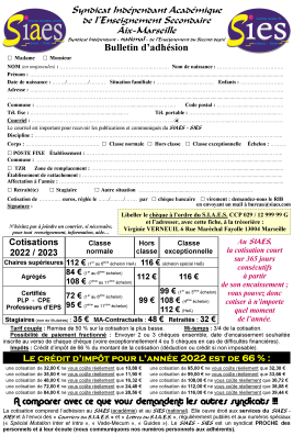 Notre site internet et toutes les informations et publications qu'il contient sont rendus possibles par le travail bénévole des responsables du SIAES - SIES et par le paiement régulier de leur cotisation syndicale par les adhérents du SIAES - SIES. Le syndicat n’emploie pas de secrétaire, l’ensemble du travail syndical est réalisé par des professeurs qui communiquent leur numéro de téléphone personnel aux adhérents. Le SIAES - SIES est financièrement indépendant. Cela garantit sa pleine indépendance de pensée et d’action. Le SIAES - SIES ne reçoit pas de subventions et refuse les ressources publicitaires, contrairement à d’autres syndicats confédérés grassement subventionnés avec de l’argent public à tel point qu’ils pourraient fonctionner sans adhérents. Soutenez notre action. Soutenez le syndicalisme indépendant. Au SIAES, la cotisation court sur 365 jours consécutifs. Vous pouvez donc adhérer à n'importe quel moment de l'année. Pour adhérer au syndicat indépendant, cliquez ICI http://www.siaes.com/infos_specifiques_siaes/inscription.pdf Représentativité du SIAES : http://www.siaes.com/diff_aix/representativite_siaes.pdf Le SIAES, c'est : - le 2ème syndicat de l'académie tous corps confondus - le 2ème syndicat pour les professeurs Agrégés - le 2ème syndicat pour les professeurs Certifiés - le 2ème syndicat pour les professeurs d'EPS - le 4ème syndicat pour les PLP |