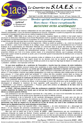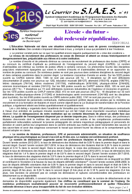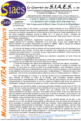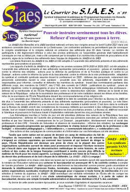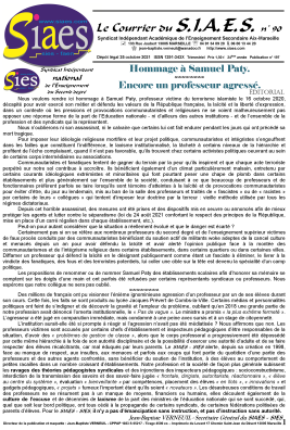 Le SIAES - SIES, c’est LE syndicat : - qui refuse que les professeurs deviennent des animateurs socio-culturels. - qui refuse la démagogie et qui rappelle que la réussite scolaire d’un élève n’est pas un droit et qu’elle se mérite par le travail et les efforts fournis. - qui refuse la soumission des professeurs et de notre institution devant les élèves et les familles. - qui refuse la soumission de l’École Républicaine devant les communautarismes et les religions.