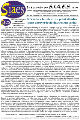 Le SIAES - SIES, c'est LE syndicat qui dénonce et combat :- La multiplication des actes d'incivilité et de violence envers les professeurs et l’impunité pour leurs auteurs. - La dévalorisation morale et sociale de notre profession. - Le renoncement, le laxisme, la démagogie, l'abaissement des exigences et du niveau et le nivellement par le bas (« primarisation » du second degré notamment du collège, « secondarisation » de l’enseignement supérieur). - La suppression de la notation au nom de l’idéologie et la mise en place d’une évaluation « bienveillante » par compétences ayant pour seul but de tenter de masquer la baisse du niveau des élèves et de généraliser le passage automatique en classe supérieure façon « tapis roulant » de la maternelle à la terminale quels que soient le niveau et les efforts fournis par l’élève. - Le pouvoir accru donné aux chefs d’établissement, aux inspecteurs, aux parents se comportant en « consommateurs » d’école. - La dégradation continue de nos conditions de travail. L’augmentation de la charge de travail. - Les réunions stériles et les emplois du temps « à trous » visant à nous caserner. - La perte considérable du pouvoir d'achat des fonctionnaires, notamment des professeurs.