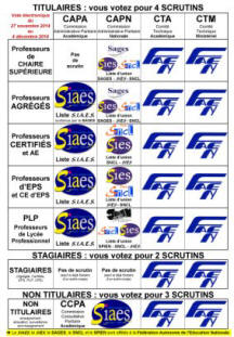 CAPA des Professeurs d'EPS : Avec 15,73 % des voix (+ 5,26 % par rapport à 2011), le SIAES conforte sa position de deuxième syndicat et obtient 2 commissaires paritaires (+ 2). Le SNEP a 8 sièges (76,85 %). L'UNSA (5,79 %) et FO (1,63 %) n'obtiennent aucun élu. Le SNALC, le SGEN, la CGT et SUD n'ont pas déposé de liste.