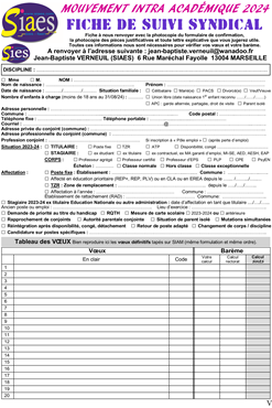 Bulletin d'adhésion. Au SIAES, la cotisation court sur 365 jours. En adhérant en mars 2024, vous serez adhérent(e) jusqu'en mars 2025. haut page AMIENS Site du Rectorat : http://www.ac-amiens.fr Adhérents, si vous ne l'avez pas déjà fait, prenez contact avec nous et communiquez-nous la liste de vos voeux provisoires avant la fermeture du serveur SIAM. Nous vous proposerons des améliorations stratégiques. 04 91 34 89 28 - 06 80 13 44 28 - jean-baptiste.verneuil@wanadoo.fr Il s'agit de nos numéros personnels (pas de standardiste ou de secrétaire) réservés aux adhérents. Déposez un message sur le répondeur téléphonique afin d'être rappelé. Calendrier des visioconférences "mutations intra" du SIAES - SIES haut page BESANÇON Site du Rectorat : http://www.ac-besancon.fr Adhérents, si vous ne l'avez pas déjà fait, prenez contact avec nous et communiquez-nous la liste de vos voeux provisoires avant la fermeture du serveur SIAM. Nous vous proposerons des améliorations stratégiques. 04 91 34 89 28 - 06 80 13 44 28 - jean-baptiste.verneuil@wanadoo.frIl s'agit de nos numéros personnels (pas de standardiste ou de secrétaire) réservés aux adhérents. Déposez un message sur le répondeur téléphonique afin d'être rappelé. Calendrier des visioconférences "mutations intra" du SIAES - SIES haut pageSite du Rectorat : http://www.ac-bordeaux.fr Adhérents, si vous ne l'avez pas déjà fait, prenez contact avec nous et communiquez-nous la liste de vos voeux provisoires avant la fermeture du serveur SIAM. Nous vous proposerons des améliorations stratégiques. 04 91 34 89 28 - 06 80 13 44 28 - jean-baptiste.verneuil@wanadoo.fr Il s'agit de nos numéros personnels (pas de standardiste ou de secrétaire) réservés aux adhérents. Déposez un message sur le répondeur téléphonique afin d'être rappelé. Calendrier des visioconférences "mutations intra" du SIAES - SIES haut page CLERMONT Site du Rectorat : http://www.ac-clermont.fr Adhérents, si vous ne l'avez pas déjà fait, prenez contact avec nous et communiquez-nous la liste de vos voeux provisoires avant la fermeture du serveur SIAM. Nous vous proposerons des améliorations stratégiques. 04 91 34 89 28 - 06 80 13 44 28 - jean-baptiste.verneuil@wanadoo.frIl s'agit de nos numéros personnels (pas de standardiste ou de secrétaire) réservés aux adhérents. Déposez un message sur le répondeur téléphonique afin d'être rappelé. Calendrier des visioconférences "mutations intra" du SIAES - SIES haut page CORSE Site du Rectorat : http://www.ac-corse.fr Adhérents, si vous ne l'avez pas déjà fait, prenez contact avec nous et communiquez-nous la liste de vos voeux provisoires avant la fermeture du serveur SIAM. Nous vous proposerons des améliorations stratégiques. 04 91 34 89 28 - 06 80 13 44 28 - jean-baptiste.verneuil@wanadoo.frIl s'agit de nos numéros personnels (pas de standardiste ou de secrétaire) réservés aux adhérents. Déposez un message sur le répondeur téléphonique afin d'être rappelé. Calendrier des visioconférences "mutations intra" du SIAES - SIES haut page CRÉTEIL Site du Rectorat : http://www.ac-creteil.fr Adhérents, si vous ne l'avez pas déjà fait, prenez contact avec nous et communiquez-nous la liste de vos voeux provisoires avant la fermeture du serveur SIAM. Nous vous proposerons des améliorations stratégiques. 04 91 34 89 28 - 06 80 13 44 28 - jean-baptiste.verneuil@wanadoo.frIl s'agit de nos numéros personnels (pas de standardiste ou de secrétaire) réservés aux adhérents. Déposez un message sur le répondeur téléphonique afin d'être rappelé. Calendrier des visioconférences "mutations intra" du SIAES - SIES haut pageSite du Rectorat : http://www.ac-dijon.fr Adhérents, si vous ne l'avez pas déjà fait, prenez contact avec nous et communiquez-nous la liste de vos voeux provisoires avant la fermeture du serveur SIAM. Nous vous proposerons des améliorations stratégiques. 04 91 34 89 28 - 06 80 13 44 28 - jean-baptiste.verneuil@wanadoo.fr Il s'agit de nos numéros personnels (pas de standardiste ou de secrétaire) réservés aux adhérents. Déposez un message sur le répondeur téléphonique afin d'être rappelé. Calendrier des visioconférences "mutations intra" du SIAES - SIES haut page GRENOBLE Site du Rectorat : http://www.ac-grenoble.fr Adhérents, si vous ne l'avez pas déjà fait, prenez contact avec nous et communiquez-nous la liste de vos voeux provisoires avant la fermeture du serveur SIAM. Nous vous proposerons des améliorations stratégiques. 04 91 34 89 28 - 06 80 13 44 28 - jean-baptiste.verneuil@wanadoo.frIl s'agit de nos numéros personnels (pas de standardiste ou de secrétaire) réservés aux adhérents. Déposez un message sur le répondeur téléphonique afin d'être rappelé. Calendrier des visioconférences "mutations intra" du SIAES - SIES haut page GUADELOUPE Site du Rectorat : http://www.ac-guadeloupe.fr Adhérents, si vous ne l'avez pas déjà fait, prenez contact avec nous et communiquez-nous la liste de vos voeux provisoires avant la fermeture du serveur SIAM. Nous vous proposerons des améliorations stratégiques. 04 91 34 89 28 - 06 80 13 44 28 - jean-baptiste.verneuil@wanadoo.frIl s'agit de nos numéros personnels (pas de standardiste ou de secrétaire) réservés aux adhérents. Déposez un message sur le répondeur téléphonique afin d'être rappelé. Calendrier des visioconférences "mutations intra" du SIAES - SIES haut page GUYANE Site du Rectorat : http://www.ac-guyane.fr Adhérents, si vous ne l'avez pas déjà fait, prenez contact avec nous et communiquez-nous la liste de vos voeux provisoires avant la fermeture du serveur SIAM. Nous vous proposerons des améliorations stratégiques. 04 91 34 89 28 - 06 80 13 44 28 - jean-baptiste.verneuil@wanadoo.frIl s'agit de nos numéros personnels (pas de standardiste ou de secrétaire) réservés aux adhérents. Déposez un message sur le répondeur téléphonique afin d'être rappelé.