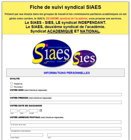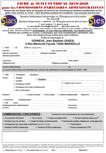 Deuxième syndicat de l'académie d'Aix Marseille tous corps confondus. Syndicat indépendant Académique et National Le SIAES - SIES, LE syndicat indépendant ! FICHE DE SUIVI SYNDICAL
